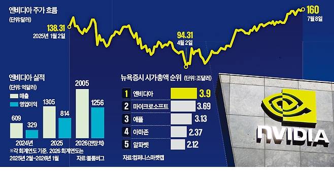 블룸버그가 집계한 애널리스트 전망치에 따르면 엔비디아의 2026회계연도(2025년 2월~2026년 1월) 매출은 전년 대비 53.7% 급증한 2005억달러, 영업이익은 54.2% 불어난 1256억달러로 예상된다. 엔비디아를 커버 중인 애널리스트 78명 중 68명이 ‘매수’ 등급을 부여했고, 목표주가는 174.37달러로 이날 종가 대비 8.98%의 상승 여력이 있다고 봤다.
