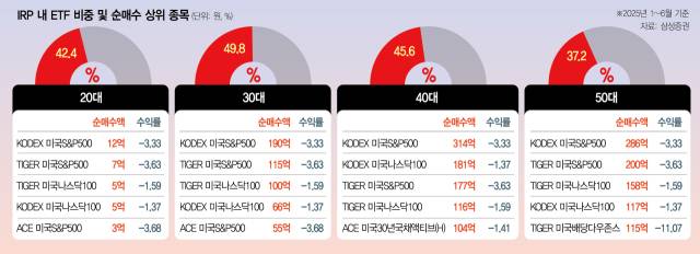 이춘규 삼성증권 연금팀장은 “IRP 세제 혜택과 더불어 장기 투자 관점에서 미국 주식 시장에 대한 관심이 높은 영향"이라며 “다만 새 정부 출범 이후 코스피 지수가 강세를 보이고 있기 때문에 국내 지수형 ETF 움직임도 고려해 볼만한 부분”이라고 설명했다. 더불어 퇴직연금 가입 연령층이 낮을수록 IRP를 통한 ETF 투자 비중이 늘어날 것으로 보인다. 삼성증권 IRP 가입 고객의 올 1~6월 포트폴리오에서 ETF 비중을 살펴보면 30대가 49.8%로 가장 높았으며 40대(45.6%)·20대(42.4%)·50대(37.2%)·60대(24.8%)·70대(11.9%) 순이다.