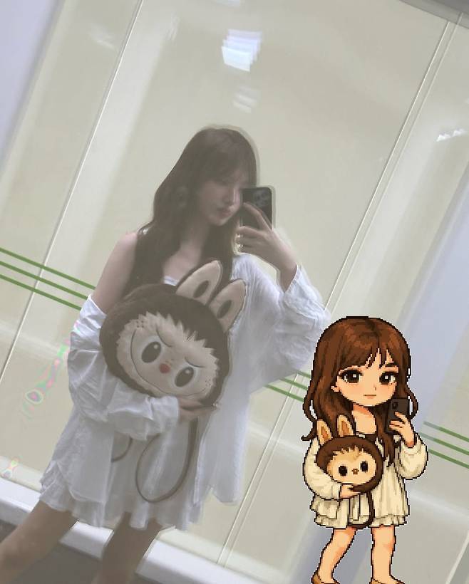거울 앞에서 자연스럽게 찍은 리즈의 셀카도 픽셀 미니미로 재탄생했습니다. 루즈한 화이트 원피스에 긴 웨이브 헤어, 그리고 귀여운 동물 캐릭터 가방까지! 실제 모습을 떠올리게 하는 미니미가 완성됐네요.