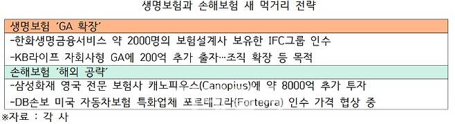 생명보험사는 법인보험대리점(GA) 채널을 적극적으로 활용해 영업력을 강화하는 반면 손해보험사는 포화한 국내 보험시장을 넘어 해외 보험사 인수·투자에 나서는 모습이다.