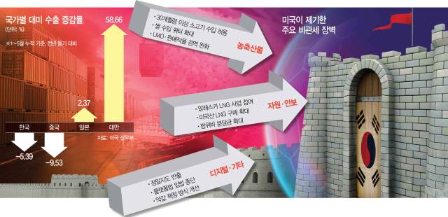 당장 미국의 관세 위협에 한국이 가장 큰 피해를 입고 있다는 분석이 나오고 있다. 미국 상무부가 최근 발표한 5월 상품 및 서비스 무역 현황을 분석한 결과 1~5월 미국이 수입한 한국산 제품은 총 531억 3400만 달러(약 73조 원)로 전년 동기 대비 5.39% 감소했다. 미국과 교역을 하는 아시아 국가 중 중국(-9.5%)에 이은 가장 큰 감소세다.