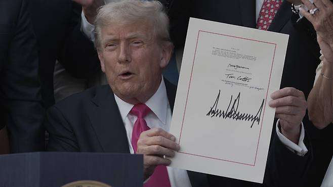 도널드 트럼프 미국 대통령이 백악관에서 집권 2기 핵심 국정 과제를 담은 법안에 서명합니다.