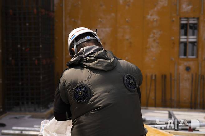 [도쿄=AP/뉴시스] 9일 일본 도쿄의 한 건설 현장에서 선풍기 달린 조끼를 착용한 근로자가 작업하고 있다. 2025.07.09.