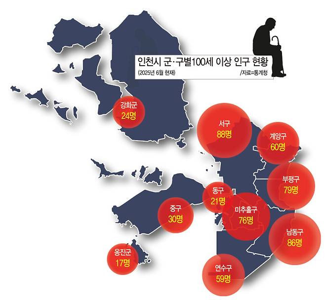 인천 내 군·구별로는 서구가 88명으로 가장 많았다. 남동구가 86명으로 뒤를 이었고 부평구 79, 미추홀구 76, 계양구 60, 연수구 59, 중구 30, 강화군 24, 동구 21, 옹진군 17명의 어르신이 100세 넘게 생존해 계신다.