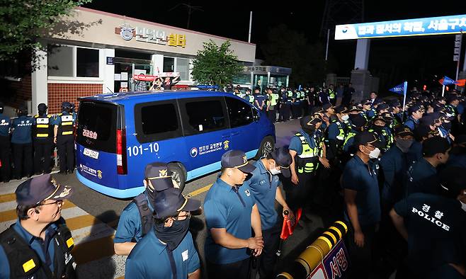 | 서울구치소 도착한 尹 호송차량 9일 윤석열 전 대통령이 구속 전 피의자 심문을 마치고 탑승한 법무부 호송 차량이 경기 의왕시 서울구치소로 들어가고 있다. 의왕=연합뉴스 |