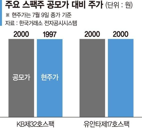 지난 1월 상장한 유안타제17호스팩 역시 이날 2000원으로 거래를 마감하며 가까스로 공모가를 유지하고 있다.