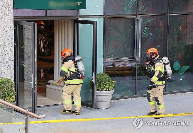 (인천=연합뉴스) 임순석 기자 = 9일 인천 서구 대단지 아파트에서 수영장 청소에 쓰이는 염소계 화학물질이 누출돼 수영장 이용 주민을 비롯한 18명이 다쳤다. 출동한 소방관들이 염소계 화학물질이 누출된 수영장으로 들어가고 있다. 2025.7.9