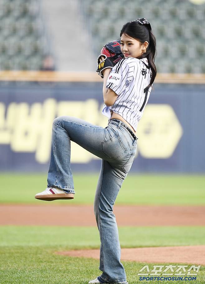 9일 서울 잠실구장에서 열린 키움-LG전. 그룹 키라스의 멤버 하린이 시구하고 있다. 잠실=정재근 기자 cjg@sportschosun.com/2025.7.9/