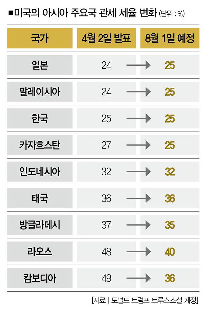 그래서 트럼프 측과의 관세 협상은 사실 무의미하다. 논리와 사실이 통하지 않기 때문이다. 트럼프 대통령이 14개 나라에 제시한 4월과 8월 관세율 차이가 거의 없다는 게 하나의 증거다. 심지어 일본은 순순히 받아들이지 않는다는 괘씸죄로 1%포인트가 더 추가됐다.