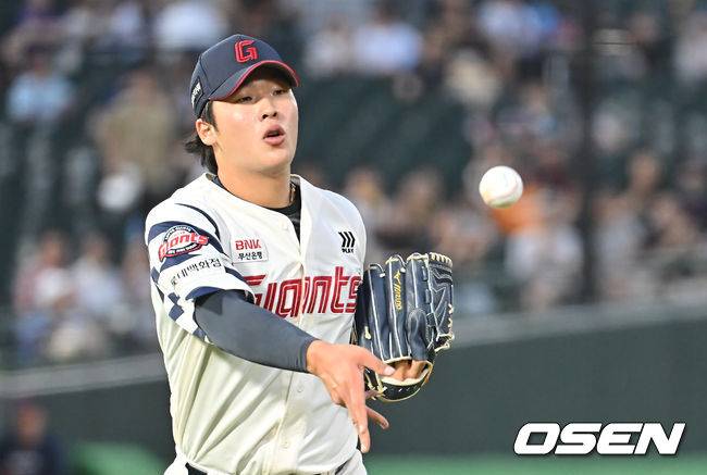 롯데 자이언츠 선발 투수 이민석이 3회초 2사 2,3루 두산 베어스 김기연의 투수 앞 땅볼을 잡아 아웃시키고 있다. 2025.07.09 / foto0307@osen.co.kr
