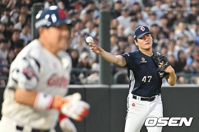두산 베어스 선발 투수 곽빈이 3회말 1사 롯데 자이언츠 우강남의 투수 앞 땅볼을 잡아 1루에 던지고 있다. 2025.07.09 / foto0307@osen.co.kr