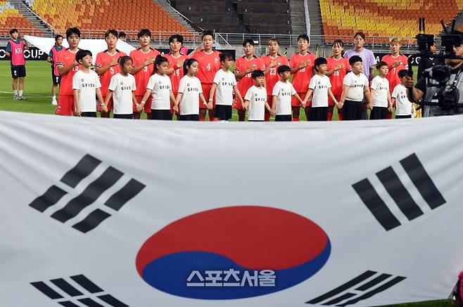 한국여자축구대표팀 선수들이 9일 수원월드컵경기장에서 열린 2025 EAFF(동아시아축구연맹) E-1 풋볼 챔피언십 중국과의 경기에 앞서 태극기를 향해 경례를 하고 있다. 2025. 7. 9.