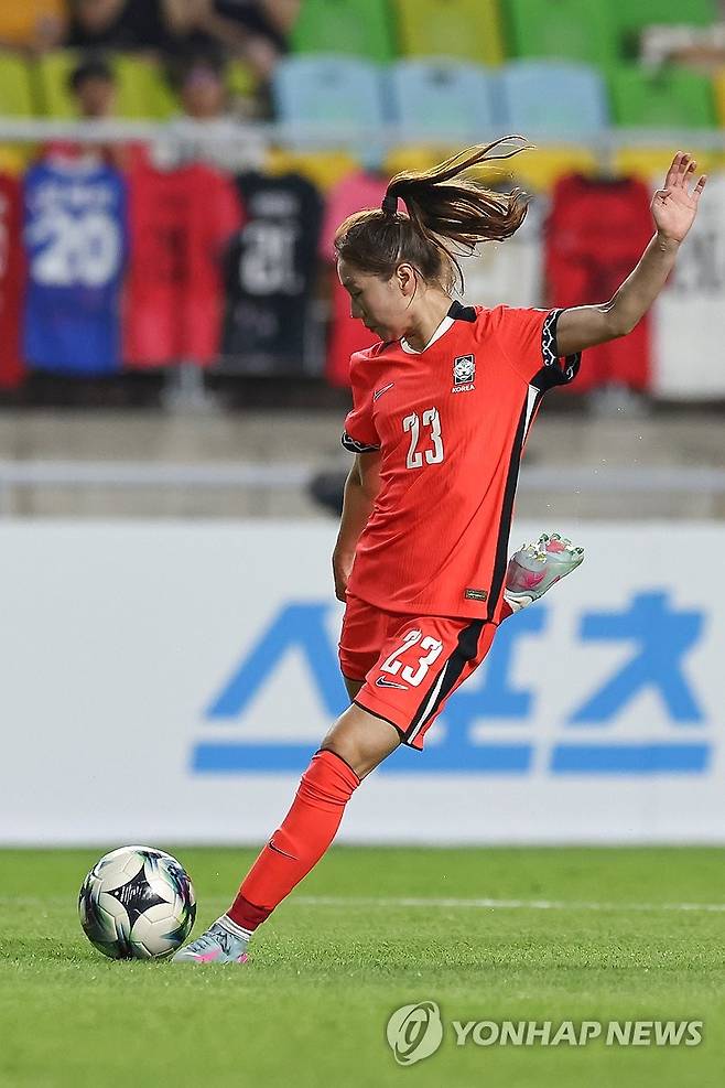 (서울=연합뉴스) 윤동진 기자 = 9일 수원월드컵경기장에서 열린 2025 동아시아축구연맹(EAFF) E-1 챔피언십(동아시안컵) 여자부 대한민국 대 중국 경기. 강채림이 슈팅하고 있다. 2025.7.9