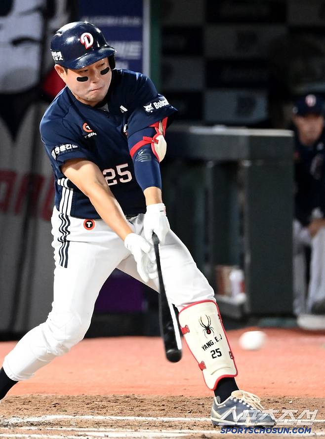 9일 부산 사직야구장에서 열린 두산과 롯데의 경기, 7회초 양의지가 안타를 치고 있다. 부산=허상욱 기자wook@sportschosun.com/2025.07.09/