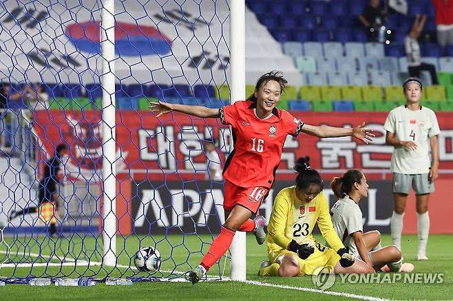 (서울=연합뉴스) 윤동진 기자 = 9일 수원월드컵경기장에서 열린 2025 동아시아축구연맹(EAFF) E-1 챔피언십(동아시안컵) 여자부 대한민국 대 중국 경기. 장슬기가 동점골을 넣은 뒤 기뻐하고 있다. 2025.7.9