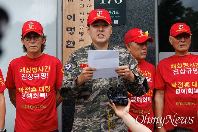 | ▲ 8일 오전 10시 채해병 특검팀 사무실 1층에서 임태훈 군인권센터 소장이 '박정훈 대령 항명 사건 항고 취하 촉구' 서명운동 경과 및 입장을 브리핑하고 있다. |