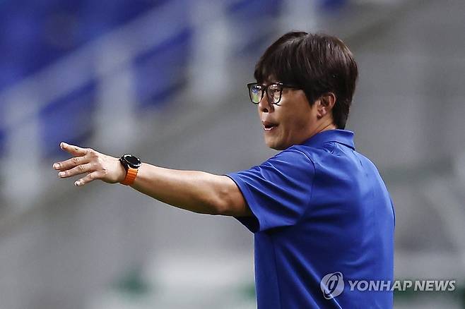 (서울=연합뉴스) 윤동진 기자 = 9일 수원월드컵경기장에서 열린 2025 동아시아축구연맹(EAFF) E-1 챔피언십(동아시안컵) 여자부 대한민국 대 중국 경기. 신상우 한국 여자축구대표팀 감독이 작전지시를 하고 있다. 2025.7.9