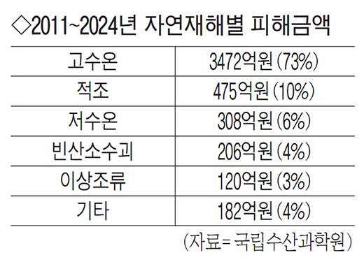 도내 어류양식장에선 지난 2012년 처음 고수온 집단폐사 피해(165만 마리)가 집계된 이후 매년 크고 작은 피해를 남겼다. 2016년 704만 마리, 2017년 343만 마리, 2018년 686만 마리, 2021년 1042만 마리가 떼죽음했다. 2023년엔 1500만 마리, 지난해에는 2828만 마리가 폐사했다.