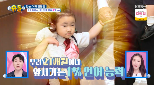 9일 방송된 KBS2 예능 '슈퍼맨이 돌아왔다'(이하 '슈돌')에서는 아빠 장동민의 지니어스 DNA를 물려받은 35개월 지우가 영재검사를 받는 모습이 그려졌다.