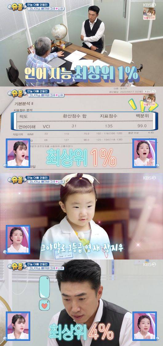지우는 언어에 있어서는 영재 수준이라는 것. 장동민은 “드디어 지니어스 가족의 탄생이 인정됐다. 저의 피를 많이 가져간 게 아닌가 갓갓갓갓의 딸내미 인정”이라고 자랑스러워했다. 심지어 35개월인 지우의 언어능력 56개월 수준이라고. 지능지수 역시 최상위 4%로 센터장은 “수능 1등급에 해당하는 지능을 갖고 있다”라고 설명했다.