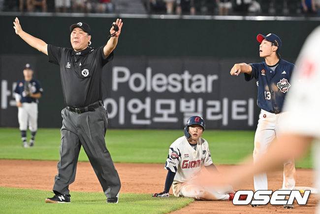 두산 베어스 이유찬이 9회말 1사 1루 롯데 자이언츠 황성빈의 2루수 땅볼때 이호준을 태그하다 넘어진 오명진을 가리키며 수비방해로 아웃 아니냐며 항의하고 있다. 2025.07.09 / foto0307@osen.co.kr