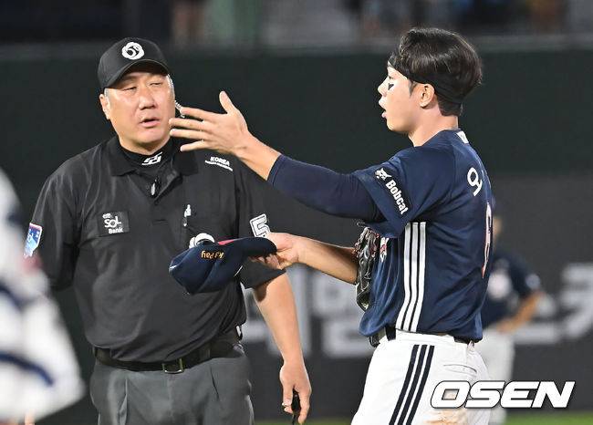 두산 베어스 오명진이 9회말 1사 1루 롯데 자이언츠 황성빈의 2루수 땅볼때 이호준을 태그하다 넘어진 후 수비방해로 아웃 아니냐며 항의하고 있다. 2025.07.09 / foto0307@osen.co.kr