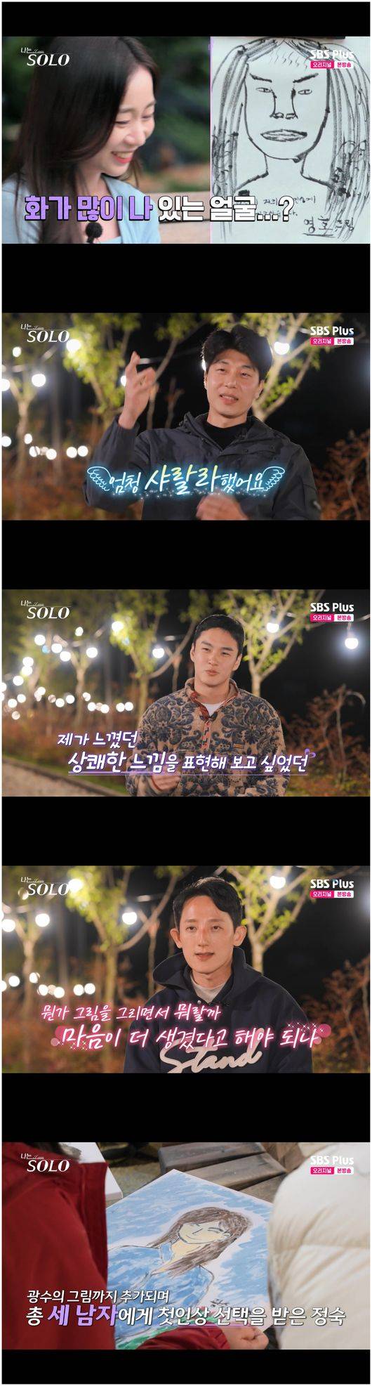 9일 방영된 SBS 예능 ‘나는 솔로’(이하 ‘나는솔로’)에서는 남성들의 첫인상 선택이 공개됐다. 노래로 화답을 받는 여성들의 방식과 다르게, 남성들은 그림으로 첫인상 선택을 보였다.