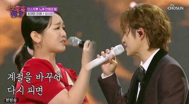이어 정미애-김희재는 가슴 절절한 화음으로 남진의 '상사화'를 재해석해 원조의 품격을 증명했다. 이에 패널들은 "대박 그 자체" "역대급"이라며 환호했다.
