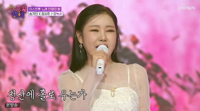 아울러, 스페셜 무대가 꾸며졌다. '미스트롯1' 진 송가인과 '미스트롯3' 진 정서주의 첫 듀엣 무대가 펼쳐진 것. 정서주는 송가인과의 무대에 "너무 꿈만 같다. 떨려서 잘 할 수 있을지 모르겠다"라며 설렘을 드러냈다.