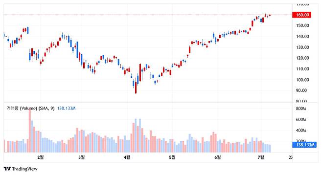 미국 동부 현지 시간으로 9일 오전에 최대 2.8% 상승한 164.42달러를 기록한 엔비디아는 역사상 가장 가치있는 기업이라는 기록을 세웠다. 이 날, 164달러 이상으로 마감할 경우 4조달러의 시가총액이 유지된다.