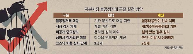 9일 금융위원회는 서울 여의도 한국거래소 서울사무실에서 금융감독원, 한국거래소와 함께 ‘자본시장 불공정거래 근절 신청 방안’을 발표하면서 한국거래소의 감시 권한을 확대하고 미공개 중요정보 이용과 관련한 심리 대상을 확대하겠다고 밝혔다.