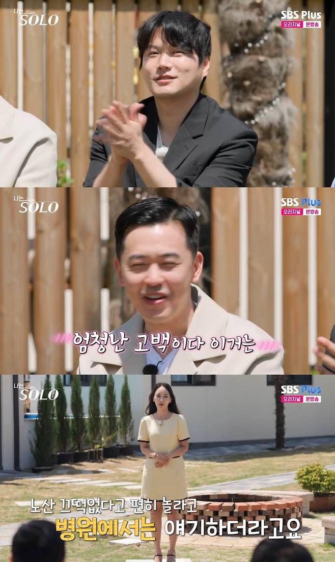 27기 순자가 "노산 끄떡없다고 편히 놀라고 병원에서 얘기하더라"며 자기소개를 마치자 영식은 "주말에만 만나는 거에 대해서 어떻게 생각하는지를 궁금해했다.