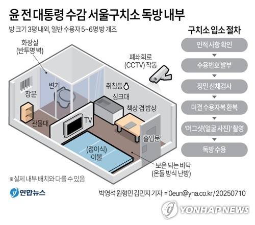 윤 전 대통령이 머물 독방에는 관물대와 접이식 밥상, TV, 싱크대, 변기 등이 있는 것으로 알려졌다. 침대는 따로 없어 바닥에 이불을 깔고 취침해야 한다.