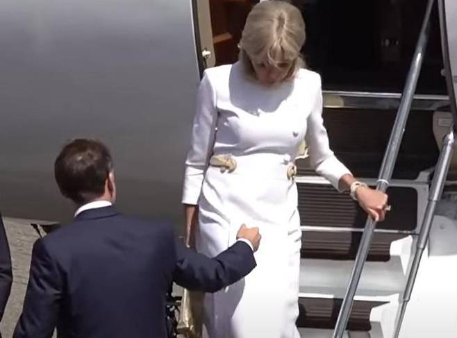 | 英 국빈방문 마크롱 부부 또 불화설 유럽연합(EU) 회원국 정상으로 10년 만에 영국을 국빈 방문한 에마뉘엘 마크롱 프랑스 대통령(가운데 줄 오른쪽)이 찰스 3세 영국 국왕과 함께 8일 왕실 마차를 타고 런던 근교 윈저성에 들어서고 있다(위쪽 사진). 이날 라이즐립의 노솔트 공군기지에 도착한 마크롱 대통령(아래쪽 사진)은 전용기에서 내리며 부인 브리지트 여사에게 손을 내밀었지만 브리지트 여사는 난간만 잡았다. 브리지트 여사의 에스코트를 무시하는 모습이 화제가 되며 두 사람의 불화설이 재점화되고 있다. 윈저=AP 뉴시스·X 캡처 |