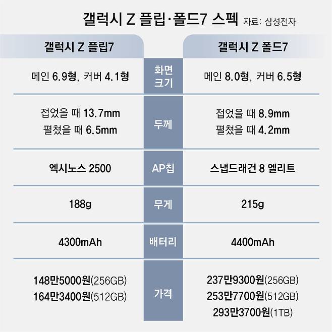 갤럭시 Z 폴드7과 갤럭시 Z 플립7은 이달 25일부터 국내를 비롯해 전 세계에 순차 출시된다. 국내 사전 판매는 15일부터 21일까지 7일간 진행된다. 갤럭시 Z 폴드7의 가격은 256GB(기가바이트) 저장공간 기준 237만9300원, 512GB 253만7700원이다. 갤럭시 Z 플립7은 256GB 148만5000원, 512GB 164만3400원으로 책정됐다.