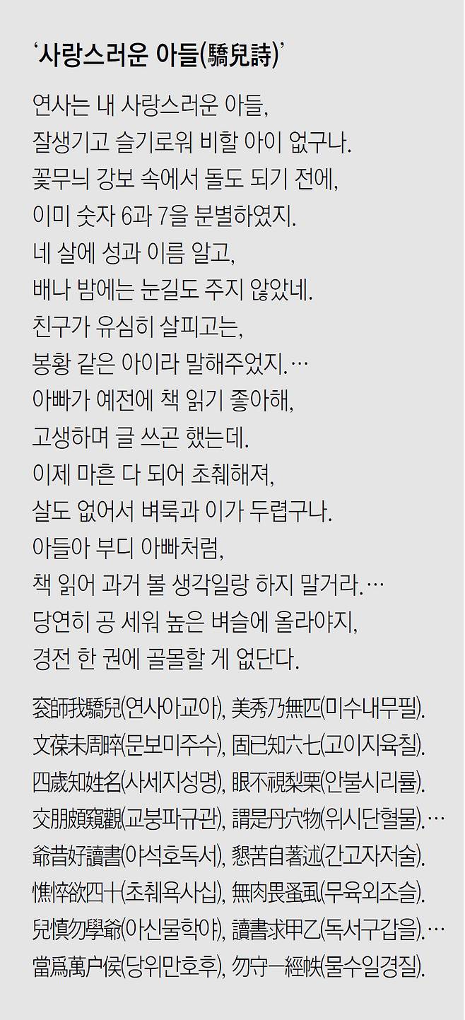 겨우 다섯 살짜리 아들을 두고 먼 옛 시인들의 자식과 비교하여 자랑한 셈이다.