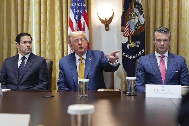 | 트럼프 연이틀 한국 압박 도널드 트럼프 미국 대통령(가운데)이 8일(현지 시간) 워싱턴 백악관에서 내각회의를 열고 관세와 방위비 등에 대해 설명하고 있다. 마코 루비오 국무장관(왼쪽), 피트 헤그세스 국방장관(오른쪽)이 대통령의 발언을 경청하고 있다. 워싱턴=AP 뉴시스 |
