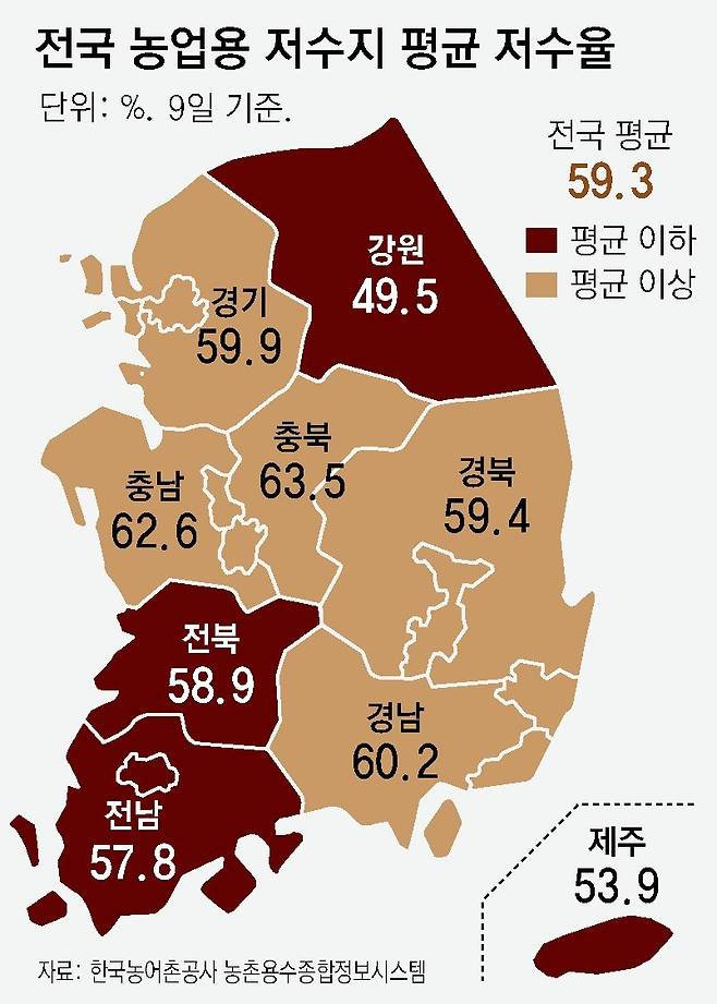 문제는 다른 지역도 여유로운 상황이 아니라는 점이다. 한국농어촌공사의 농업용 저수지 저수율 현황 자료에 따르면 9일 기준 각 지역 평균 저수율은 강원 49.5%, 제주 53.9%, 전남 57.8%, 전북 58.9%로, 평년 평균(64.2%)보다 많게는 15% 가까이 낮았다. 강릉 사천저수지 저수율은 20.6%, 전남 완도군 노화면 넙도저수지는 26%에 그쳤다.