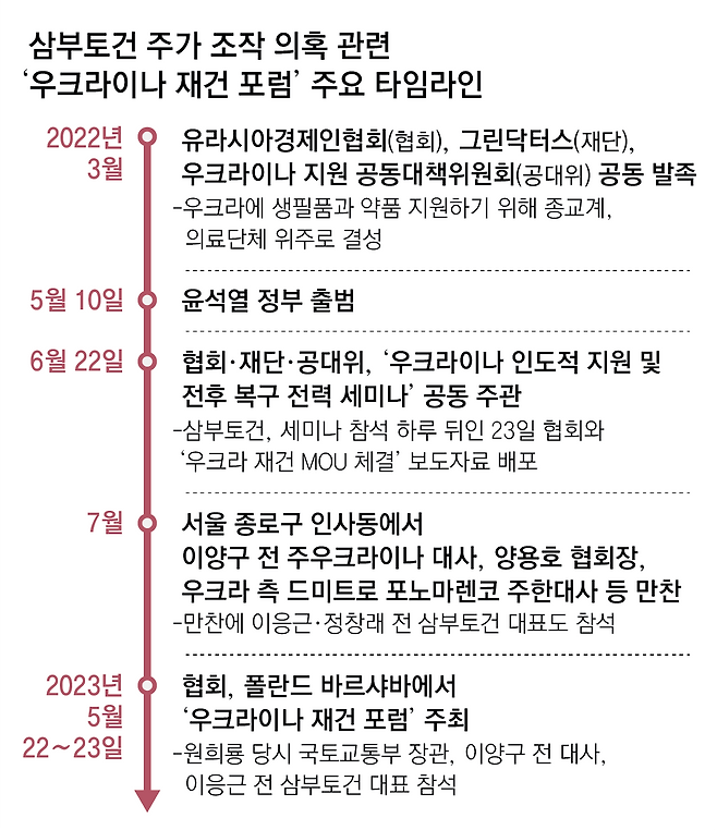 공익적 성격의 단체가 변하기 시작한 건 윤석열 전 대통령 취임 약 한 달 뒤인 2022년 6월 22일부터다. 공대위는 당시 부산에서 우크라이나에 대한 인도적 지원 및 전후 복구를 논의하기 위한 세미나를 열었는데, 여기엔 ‘유라시아경제인협회’와 국제 의료봉사 공익재단 ‘그린닥터스’, 삼부토건 임원급 인사들이 참석했다.