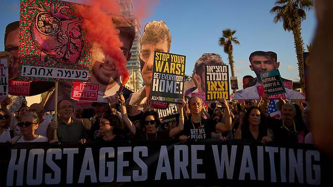 ▲ 이스라엘 텔아비브에서 인질 석방 촉구하는 시위대