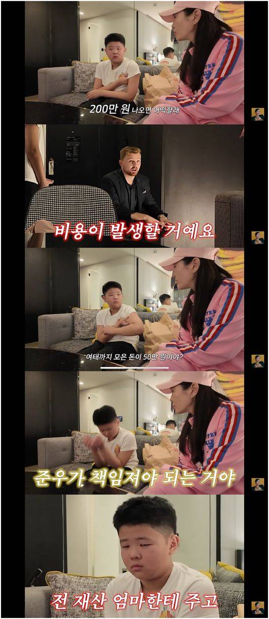 준우는 “저는 50만 원이 있다”라고 말했다. 12년 생애를 걸쳐 모아온 용돈이었다. 장영란은 “그럼 엄마가 150만 원을 빌려주겠다. 준우가 책임을 져야 한다”라고 말했다.