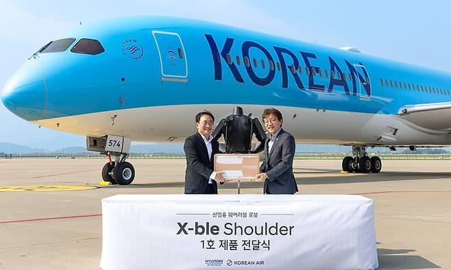 현대차·기아는 8일 인천 중구 대한항공 항공기 정비고에서 산업용 착용로봇 ‘엑스블 숄더’ 1호 전달식(사진)을 진행했다고 9일 밝혔다.