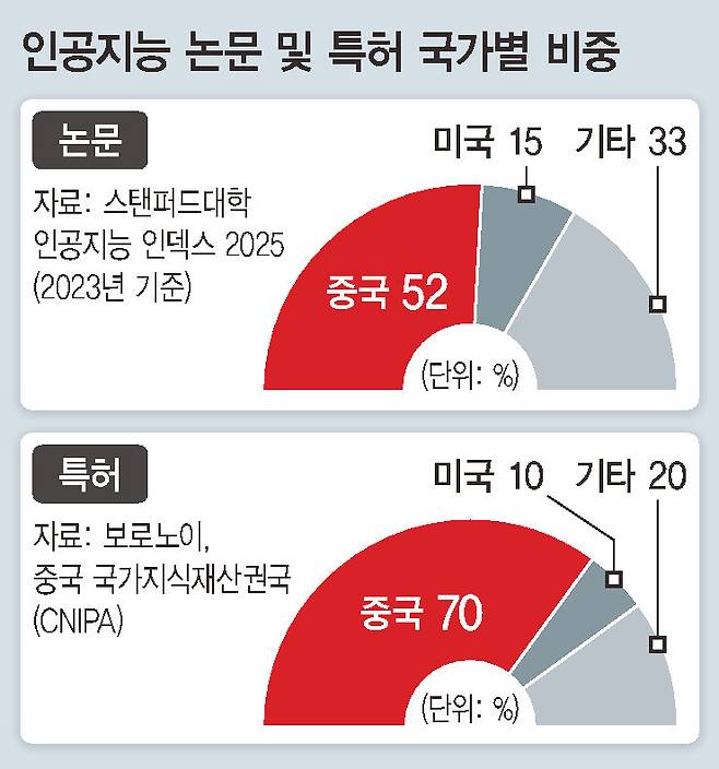 중국의 첨단 기술·산업 전략인 ‘중국 제조 2025’가 10년 전인 2015년 수립되고 이후 시행되면서 ‘인재 대군단 전략’은 가속화했다. 그 연구 성과는 뚜렷하게 나타나고 있다. 스탠퍼드대 인간중심인공지능연구소(HAI)가 발표한 ‘인공지능 인덱스 2025’를 보면, 중국은 인공지능 전문 학술 논문 수와 특허 출원 건수에서 미국을 추월했다. 중국은 인공지능 분야 전체 연구 논문 수에서 1위를 차지하고 있다. 2023년을 기준으로 세계 인공지능 논문 24만편 가운데 절반 이상이 중국 학자가 쓴 논문이었다. 또 같은 해 나온 인공지능 관련 37만8천건의 특허 가운데 70%를 중국이 보유하고 있는 것으로 나타났다.
