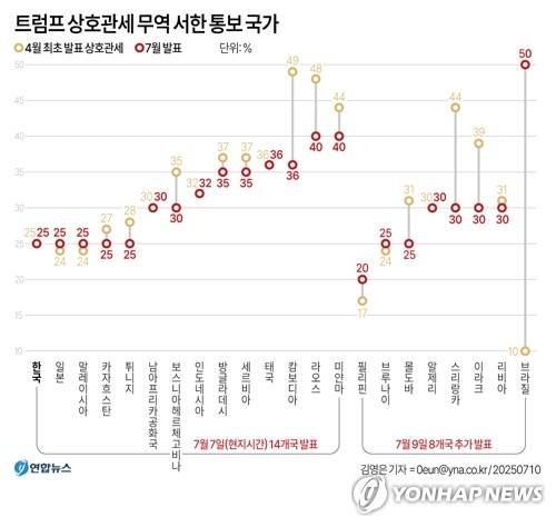 트럼프 대통령은 이날 필리핀에 대해 20%, 브루나이·몰도바에 각각 25%, 알제리·이라크·리비아·스리랑카에 각각 30%, 브라질에 50%의 상호관세율을 적시한 총 8건의 서한을 사회관계망서비스(SNS) 트루스소셜에 올렸다.