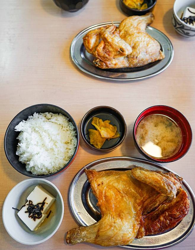 닭 반 마리를 통째로 튀겨낸 통닭 메뉴가 시그니처고 밥과 미소시루(된장국)를 곁들인 영계정식이 가성비가 괜찮다. 두껍지 않은 튀김옷에 닭 본연의 맛을 즐길 수 있는데, 우리 시장 통닭과 비슷한 느낌이다.