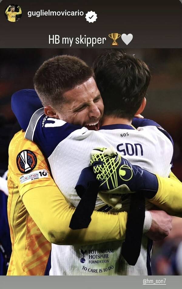 또다른 ‘부주장’ 굴리엘모 비카리오도 손흥민에게 메시지를 보냈다. 비카리오 또한 개인 SNS를 통해 UEL 우승 직후 손흥민과 포옹하는 사진을 게재하며 “생일 축하해 우리 주장님”이라는 문구를 남겼다. 33번째 생일을 맞은 손흥민도 매디슨, 비카리오의 게시물을 리그램하며 우정을 과시했다.