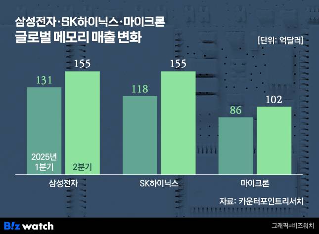 글로벌 시장 조사 업체 카운터포인트리서치에 따르면 올해 2분기 기준 전세계 D램 및 낸드 등 메모리 사업 매출은 삼성전자와 SK하이닉스가 각각 155억달러의 매출을 기록한 것으로 집계됐다. 공동 선두다.