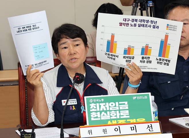 | ▲ 최저임금위원회 근로자위원인 이미선 민주노총 부위원장이 3일 정부세종청사에서 열린 최저임금위원회 제9차 전원회의에서 '대구-경북 대학생-청년 열악한 노동 실태조사 결과'를 보이며 발언하고 있다. |