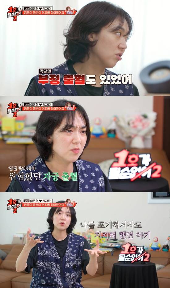 이은형은 "그 땐 별 생각이 다 들었다. 원래 (임신) 막달에는 출혈이 있으면 안 되기 때문"이라며 "혹시 잘못되면 나를 포기해서라도 현조를 낳아야겠다는 생각이 들었다. 유언장이라기보다, 나보다는 현조를 택하자는 생각도 했었다"고 이야기했다.