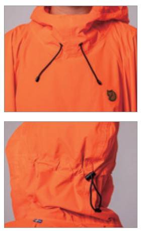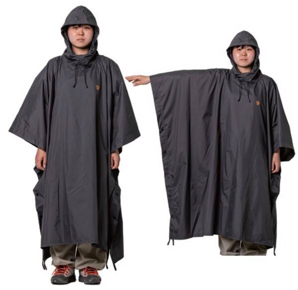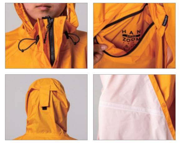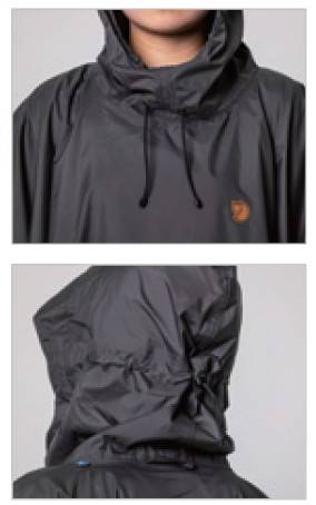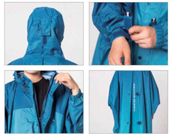 앞쪽 버튼과 지퍼로 착용이 가능한 레인코트형 판초우의다. 소매에도 시보리 처리와 함께 벨크로 디테일이 있어 길이 조절이 가능하다. 등 뒤 버튼으로도 사이즈를 조절할 수 있다. 전체적으로 디테일이 많이 들어가 있는 제품이지만 큰 패킹 사이즈와 무게가 부담스러울 수 있다.